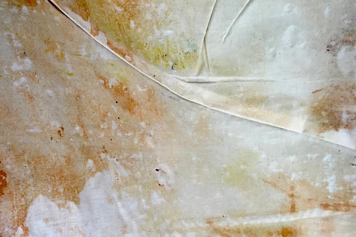 The idea of the tangible surface of the Sun is an illusion that we can nevertheless reach in paintings. The surface – or the image of what it looks like to our eyes – guides both the making of Pohjolainen’s paintings and the way how she treats these visions. In works made with acrylic paint, the canvas wrinkles, creases, becomes smooth and settles. Pohjolainen handles the ground of paintings as if they were textile works by sewing the canvas with a machine. What results from this work is something like a satellite-transmitted image taken at an immense distance, or alternatively extremely close: one may perceive traces of sand, mud, water or rock on surfaces, or a view magnified countless times by a microscope, invisible to the bare eye. To define the imagined distance implies a choice of where to focus one’s gaze: whether to align it with the unimaginable size of geological elements, or the figures on the canvas? The colours shimmer with shades of the earth, yellow, orange and brown, lava-like hot red, cool blue and grey, reminiscent of the night that falls on the planetary surface. The variation of terrain is tangible, and one can have a close look at its surface.