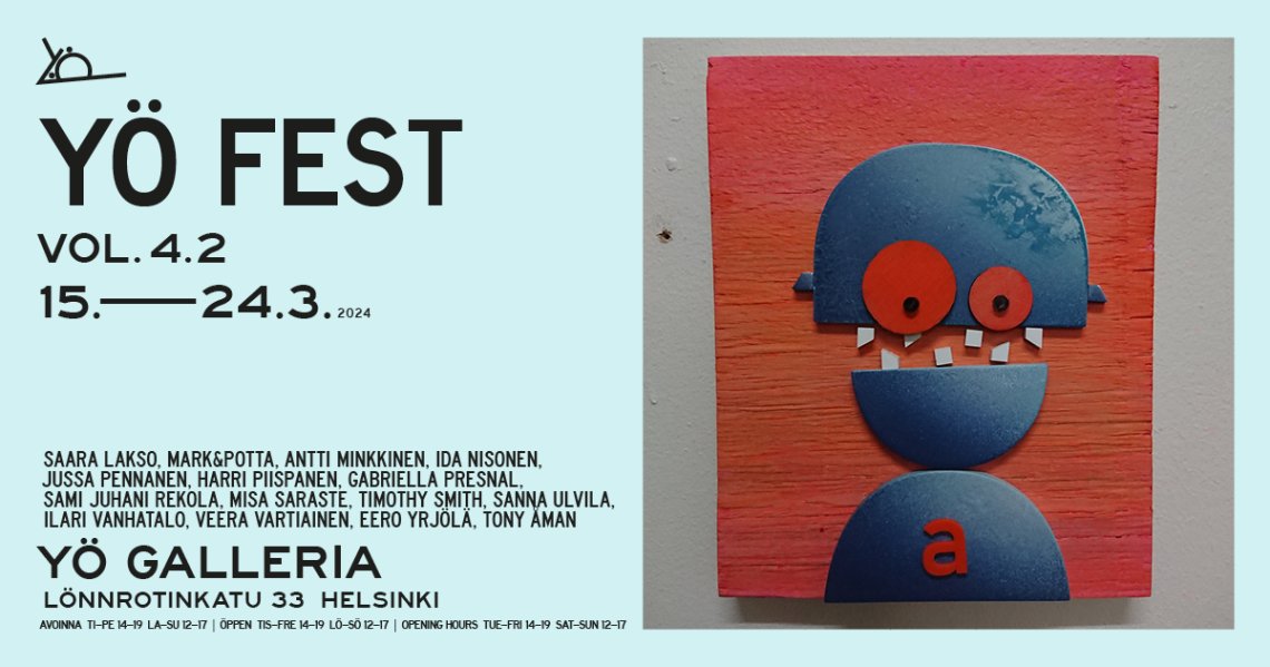 Yö Fest vol. 4 is a free art festival in the heart of Helsinki running for two and a half months. The yearly multidisciplinary art festival by Artists' Association Yö enriches and enlivens the capital's culture. Yö Fest vol. 4 offers a wide selection of art from a diversity of disciplines and artists.