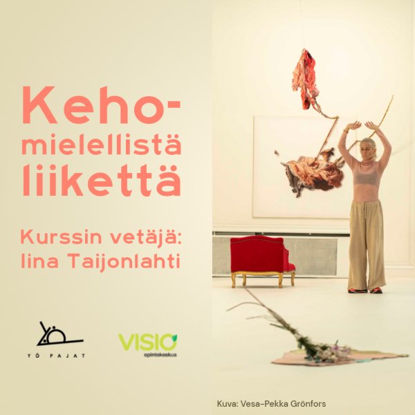 25.09.2023 - 23.10.2023Kurssilla rakennamme helppojen liikkeelisten harjoitteiden kautta yhteyttä omaan kehoon sekä muiden kehoihin. Kurssilla tehdään keho-mielellisiä harjoitteita, jotka pohjaavat muun muassa nykytanssiin, kontakti-improvisaatioon, qigongiin, biomekaniikkaan sekä polyvagaaliseen teoriaan. Tutkimme näiden harjoitteiden kautta muun muassa katseen ja liikkeen yhteyttä. Ammennamme inspiraatiota myös Yö Gallerian sen hetkisestä näyttelystä.
