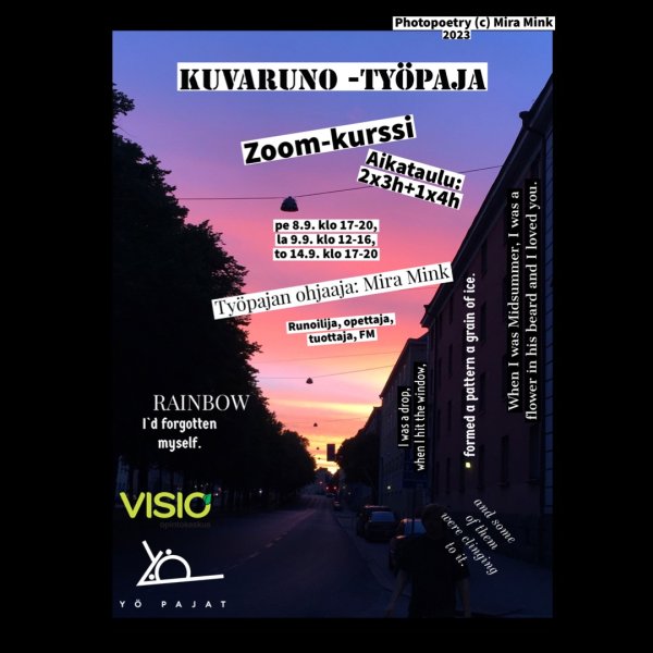 08.09.2023Kurssilla käsitellään kuvarunon aihepiiriä monipuolisesti mm.
